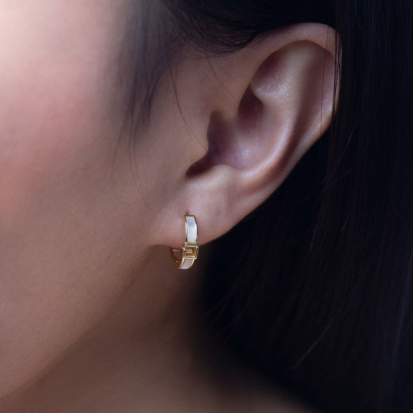 The Silver Glow Opal Huggies feature soft, curved lines accented by the opalescent shimmer of opal inlay. Made from 18k gold-plated 925 Sterling Silver, it has a polished, golden shine that resists tarnish and keeps them looking fresh over time. The opal inlay adds a delicate, pearly shimmer, while the front of the hoop features a geometric motif for a contemporary edge.